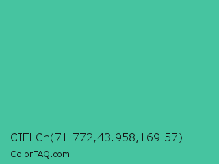 CIELCh 71.772,43.958,169.57 Color is a normal green color and the nearest color is Puerto Rico #3fc1aa. Hex code #46c4a0 and RGB value is rgb(70,196,160). In RGB color space, this color is composed of 27% red, 77% green, 63% blue, In CMYK color space, this color is composed of 64% cyan, 0% magenta, 18% yellow , 23% black , In HSL color space, this color has a hue angle of 163° , 52% saturation and 52% lightness.