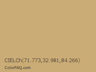 CIELCh 71.773,32.981,84.266 Color is a light orange color and the nearest color is Light French Beige #c8ad7f. Hex code #caac74 and RGB value is rgb(202,172,116). In RGB color space, this color is composed of 79% red, 67% green, 45% blue, In CMYK color space, this color is composed of 0% cyan, 15% magenta, 43% yellow , 21% black , In HSL color space, this color has a hue angle of 39° , 45% saturation and 62% lightness.