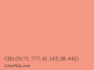 CIELCh 71.777,41.165,38.442 Color is a light red color and the nearest color is Vivid Tangerine #ff9980. Hex code #f49883 and RGB value is rgb(244,152,131). In RGB color space, this color is composed of 96% red, 60% green, 51% blue, In CMYK color space, this color is composed of 0% cyan, 38% magenta, 46% yellow , 4% black , In HSL color space, this color has a hue angle of 11° , 84% saturation and 74% lightness.