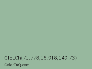 CIELCh 71.778,18.918,149.73 Color is a light green color and the nearest color is Summer Green #96bbab. Hex code #97b89e and RGB value is rgb(151,184,158). In RGB color space, this color is composed of 59% red, 72% green, 62% blue, In CMYK color space, this color is composed of 18% cyan, 0% magenta, 14% yellow , 28% black , In HSL color space, this color has a hue angle of 133° , 19% saturation and 66% lightness.
