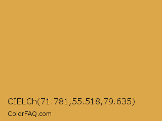 CIELCh 71.781,55.518,79.635 Color is a normal orange color and the nearest color is Indian Yellow #e3a857. Hex code #dca749 and RGB value is rgb(220,167,73). In RGB color space, this color is composed of 86% red, 65% green, 29% blue, In CMYK color space, this color is composed of 0% cyan, 24% magenta, 67% yellow , 14% black , In HSL color space, this color has a hue angle of 38° , 68% saturation and 57% lightness.
