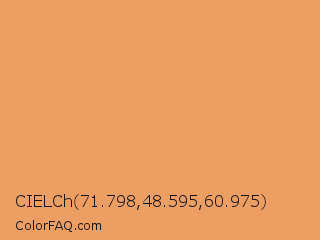 CIELCh 71.798,48.595,60.975 Color is a light orange color and the nearest color is Sandy Brown #f4a460. Hex code #ed9e63 and RGB value is rgb(237,158,99). In RGB color space, this color is composed of 93% red, 62% green, 39% blue, In CMYK color space, this color is composed of 0% cyan, 33% magenta, 58% yellow , 7% black , In HSL color space, this color has a hue angle of 26° , 79% saturation and 66% lightness.