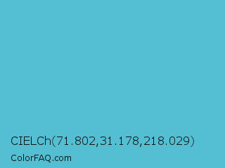 CIELCh 71.802,31.178,218.029 Color is a normal cyan color and the nearest color is Sea Serpent #4bc7cf. Hex code #54bed2 and RGB value is rgb(84,190,210). In RGB color space, this color is composed of 33% red, 75% green, 82% blue, In CMYK color space, this color is composed of 60% cyan, 10% magenta, 0% yellow , 18% black , In HSL color space, this color has a hue angle of 190° , 58% saturation and 58% lightness.