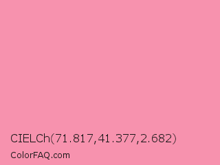 CIELCh 71.817,41.377,2.682 Color is a light rose color and the nearest color is Flamingo Pink #fc8eac. Hex code #f792ae and RGB value is rgb(247,146,174). In RGB color space, this color is composed of 97% red, 57% green, 68% blue, In CMYK color space, this color is composed of 0% cyan, 41% magenta, 30% yellow , 3% black , In HSL color space, this color has a hue angle of 343° , 86% saturation and 77% lightness.