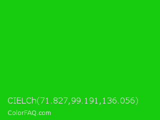 CIELCh 71.827,99.191,136.056 Color is a normal green color and the nearest color is Vivid Malachite #00cc33. Hex code #17cc0f and RGB value is rgb(23,204,15). In RGB color space, this color is composed of 9% red, 80% green, 6% blue, In CMYK color space, this color is composed of 89% cyan, 0% magenta, 93% yellow , 20% black , In HSL color space, this color has a hue angle of 117° , 86% saturation and 43% lightness.
