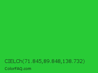 CIELCh 71.845,89.848,138.732 Color is a normal green color and the nearest color is Lime Green #32cd32. Hex code #28cb36 and RGB value is rgb(40,203,54). In RGB color space, this color is composed of 16% red, 80% green, 21% blue, In CMYK color space, this color is composed of 80% cyan, 0% magenta, 73% yellow , 20% black , In HSL color space, this color has a hue angle of 125° , 67% saturation and 48% lightness.
