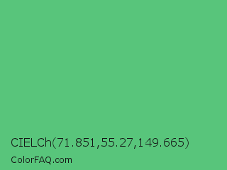 CIELCh 71.851,55.27,149.665 Color is a normal green color and the nearest color is Emerald #50c878. Hex code #58c57b and RGB value is rgb(88,197,123). In RGB color space, this color is composed of 35% red, 77% green, 48% blue, In CMYK color space, this color is composed of 55% cyan, 0% magenta, 38% yellow , 23% black , In HSL color space, this color has a hue angle of 139° , 48% saturation and 56% lightness.