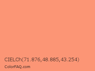 CIELCh 71.876,48.885,43.254 Color is a light red color and the nearest color is Vivid Tangerine #ff9980. Hex code #fc9575 and RGB value is rgb(252,149,117). In RGB color space, this color is composed of 99% red, 58% green, 46% blue, In CMYK color space, this color is composed of 0% cyan, 41% magenta, 54% yellow , 1% black , In HSL color space, this color has a hue angle of 14° , 96% saturation and 72% lightness.