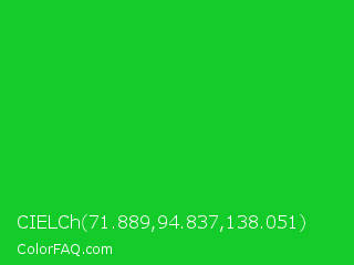 CIELCh 71.889,94.837,138.051 Color is a normal green color and the nearest color is Vivid Malachite #00cc33. Hex code #14cc29 and RGB value is rgb(20,204,41). In RGB color space, this color is composed of 8% red, 80% green, 16% blue, In CMYK color space, this color is composed of 90% cyan, 0% magenta, 80% yellow , 20% black , In HSL color space, this color has a hue angle of 127° , 82% saturation and 44% lightness.