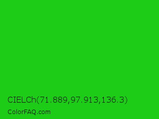 CIELCh 71.889,97.913,136.3 Color is a normal green color and the nearest color is Lime Green #32cd32. Hex code #1ccc17 and RGB value is rgb(28,204,23). In RGB color space, this color is composed of 11% red, 80% green, 9% blue, In CMYK color space, this color is composed of 86% cyan, 0% magenta, 89% yellow , 20% black , In HSL color space, this color has a hue angle of 118° , 80% saturation and 45% lightness.
