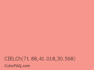 CIELCh 71.88,41.018,30.568 Color is a light red color and the nearest color is Vivid Tangerine #ffa089. Hex code #f7968c and RGB value is rgb(247,150,140). In RGB color space, this color is composed of 97% red, 59% green, 55% blue, In CMYK color space, this color is composed of 0% cyan, 39% magenta, 43% yellow , 3% black , In HSL color space, this color has a hue angle of 6° , 87% saturation and 76% lightness.