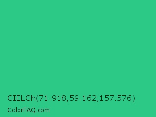 CIELCh 71.918,59.162,157.576 Color is a normal green color and the nearest color is Mountain Meadow #30ba8f. Hex code #2cc885 and RGB value is rgb(44,200,133). In RGB color space, this color is composed of 17% red, 78% green, 52% blue, In CMYK color space, this color is composed of 78% cyan, 0% magenta, 34% yellow , 22% black , In HSL color space, this color has a hue angle of 154° , 64% saturation and 48% lightness.
