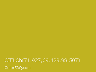CIELCh 71.927,69.429,98.507 Color is a normal yellow color and the nearest color is Hokey Pokey #c8a528. Hex code #c0b320 and RGB value is rgb(192,179,32). In RGB color space, this color is composed of 75% red, 70% green, 13% blue, In CMYK color space, this color is composed of 0% cyan, 7% magenta, 83% yellow , 25% black , In HSL color space, this color has a hue angle of 55° , 71% saturation and 44% lightness.