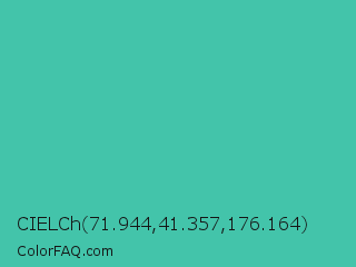 CIELCh 71.944,41.357,176.164 Color is a normal cyan color and the nearest color is Puerto Rico #3fc1aa. Hex code #43c4aa and RGB value is rgb(67,196,170). In RGB color space, this color is composed of 26% red, 77% green, 67% blue, In CMYK color space, this color is composed of 66% cyan, 0% magenta, 13% yellow , 23% black , In HSL color space, this color has a hue angle of 168° , 52% saturation and 52% lightness.