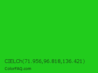 CIELCh 71.956,96.818,136.421 Color is a normal green color and the nearest color is Lime Green #32cd32. Hex code #21cc1c and RGB value is rgb(33,204,28). In RGB color space, this color is composed of 13% red, 80% green, 11% blue, In CMYK color space, this color is composed of 84% cyan, 0% magenta, 86% yellow , 20% black , In HSL color space, this color has a hue angle of 118° , 76% saturation and 45% lightness.