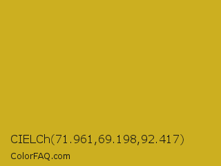 CIELCh 71.961,69.198,92.417 Color is a normal yellow color and the nearest color is Hokey Pokey #c8a528. Hex code #ccaf20 and RGB value is rgb(204,175,32). In RGB color space, this color is composed of 80% red, 69% green, 13% blue, In CMYK color space, this color is composed of 0% cyan, 14% magenta, 84% yellow , 20% black , In HSL color space, this color has a hue angle of 50° , 73% saturation and 46% lightness.