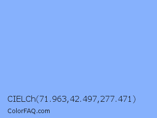 CIELCh 71.963,42.497,277.471 Color is a light blue color and the nearest color is Jordy Blue #8ab9f1. Hex code #86b1fd and RGB value is rgb(134,177,253). In RGB color space, this color is composed of 53% red, 69% green, 99% blue, In CMYK color space, this color is composed of 47% cyan, 30% magenta, 0% yellow , 1% black , In HSL color space, this color has a hue angle of 218° , 97% saturation and 76% lightness.