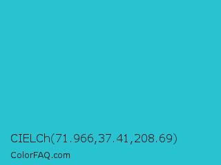 CIELCh 71.966,37.41,208.69 Color is a normal cyan color and the nearest color is Scooter #2ebfd4. Hex code #29c2d0 and RGB value is rgb(41,194,208). In RGB color space, this color is composed of 16% red, 76% green, 82% blue, In CMYK color space, this color is composed of 80% cyan, 7% magenta, 0% yellow , 18% black , In HSL color space, this color has a hue angle of 185° , 67% saturation and 49% lightness.