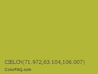 CIELCh 71.972,63.104,106.007 Color is a normal yellow color and the nearest color is Brass #b5a642. Hex code #b2b738 and RGB value is rgb(178,183,56). In RGB color space, this color is composed of 70% red, 72% green, 22% blue, In CMYK color space, this color is composed of 3% cyan, 0% magenta, 69% yellow , 28% black , In HSL color space, this color has a hue angle of 62° , 53% saturation and 47% lightness.