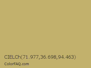 CIELCh 71.977,36.698,94.463 Color is a normal yellow color and the nearest color is Dark Khaki #bdb76b. Hex code #c2b06d and RGB value is rgb(194,176,109). In RGB color space, this color is composed of 76% red, 69% green, 43% blue, In CMYK color space, this color is composed of 0% cyan, 9% magenta, 44% yellow , 24% black , In HSL color space, this color has a hue angle of 47° , 41% saturation and 59% lightness.