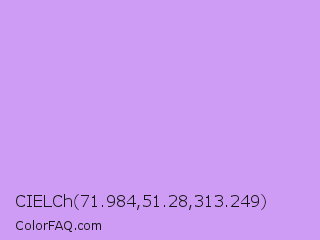 CIELCh 71.984,51.28,313.249 Color is a light purple color and the nearest color is Pale Violet #cc99ff. Hex code #cf9cf5 and RGB value is rgb(207,156,245). In RGB color space, this color is composed of 81% red, 61% green, 96% blue, In CMYK color space, this color is composed of 16% cyan, 36% magenta, 0% yellow , 4% black , In HSL color space, this color has a hue angle of 274° , 82% saturation and 79% lightness.
