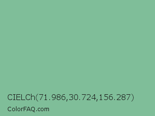 CIELCh 71.986,30.724,156.287 Color is a light green color and the nearest color is Acapulco #7cb0a1. Hex code #7fbe99 and RGB value is rgb(127,190,153). In RGB color space, this color is composed of 50% red, 75% green, 60% blue, In CMYK color space, this color is composed of 33% cyan, 0% magenta, 19% yellow , 25% black , In HSL color space, this color has a hue angle of 145° , 33% saturation and 62% lightness.