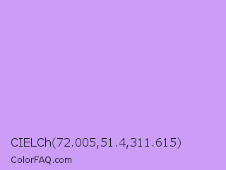 CIELCh 72.005,51.4,311.615 Color is a light purple color and the nearest color is Pale Violet #cc99ff. Hex code #cc9df7 and RGB value is rgb(204,157,247). In RGB color space, this color is composed of 80% red, 62% green, 97% blue, In CMYK color space, this color is composed of 17% cyan, 36% magenta, 0% yellow , 3% black , In HSL color space, this color has a hue angle of 271° , 85% saturation and 79% lightness.
