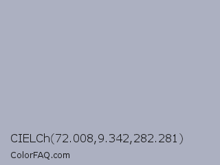 CIELCh 72.008,9.342,282.281 Color is a light blue color and the nearest color is Cadet Blue #a9b2c3. Hex code #acb0c1 and RGB value is rgb(172,176,193). In RGB color space, this color is composed of 67% red, 69% green, 76% blue, In CMYK color space, this color is composed of 11% cyan, 9% magenta, 0% yellow , 24% black , In HSL color space, this color has a hue angle of 229° , 14% saturation and 72% lightness.