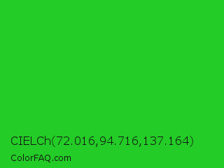 CIELCh 72.016,94.716,137.164 Color is a normal green color and the nearest color is Lime Green #32cd32. Hex code #23cc26 and RGB value is rgb(35,204,38). In RGB color space, this color is composed of 14% red, 80% green, 15% blue, In CMYK color space, this color is composed of 83% cyan, 0% magenta, 81% yellow , 20% black , In HSL color space, this color has a hue angle of 121° , 71% saturation and 47% lightness.