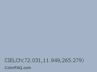 CIELCh 72.031,11.949,265.279 Color is a light blue color and the nearest color is Cadet Blue #a9b2c3. Hex code #a3b2c6 and RGB value is rgb(163,178,198). In RGB color space, this color is composed of 64% red, 70% green, 78% blue, In CMYK color space, this color is composed of 18% cyan, 10% magenta, 0% yellow , 22% black , In HSL color space, this color has a hue angle of 214° , 23% saturation and 71% lightness.