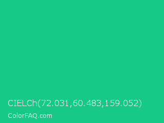 CIELCh 72.031,60.483,159.052 Color is a normal green color and the nearest color is Mountain Meadow Crayola #1ab385. Hex code #17c987 and RGB value is rgb(23,201,135). In RGB color space, this color is composed of 9% red, 79% green, 53% blue, In CMYK color space, this color is composed of 89% cyan, 0% magenta, 33% yellow , 21% black , In HSL color space, this color has a hue angle of 158° , 79% saturation and 44% lightness.