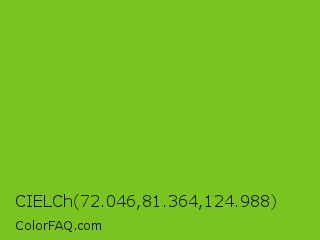 CIELCh 72.046,81.364,124.988 Color is a normal green color and the nearest color is Lima #76bd17. Hex code #7ac421 and RGB value is rgb(122,196,33). In RGB color space, this color is composed of 48% red, 77% green, 13% blue, In CMYK color space, this color is composed of 38% cyan, 0% magenta, 83% yellow , 23% black , In HSL color space, this color has a hue angle of 87° , 71% saturation and 45% lightness.