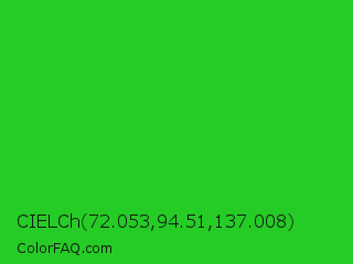 CIELCh 72.053,94.51,137.008 Color is a normal green color and the nearest color is Lime Green #32cd32. Hex code #26cc26 and RGB value is rgb(38,204,38). In RGB color space, this color is composed of 15% red, 80% green, 15% blue, In CMYK color space, this color is composed of 81% cyan, 0% magenta, 81% yellow , 20% black , In HSL color space, this color has a hue angle of 120° , 69% saturation and 47% lightness.