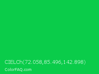 CIELCh 72.058,85.496,142.898 Color is a normal green color and the nearest color is Malachite #0bda51. Hex code #0acc4a and RGB value is rgb(10,204,74). In RGB color space, this color is composed of 4% red, 80% green, 29% blue, In CMYK color space, this color is composed of 95% cyan, 0% magenta, 64% yellow , 20% black , In HSL color space, this color has a hue angle of 140° , 91% saturation and 42% lightness.