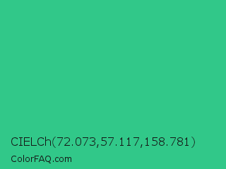CIELCh 72.073,57.117,158.781 Color is a normal green color and the nearest color is Mountain Meadow #30ba8f. Hex code #31c889 and RGB value is rgb(49,200,137). In RGB color space, this color is composed of 19% red, 78% green, 54% blue, In CMYK color space, this color is composed of 76% cyan, 0% magenta, 32% yellow , 22% black , In HSL color space, this color has a hue angle of 155° , 61% saturation and 49% lightness.