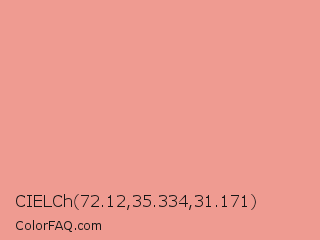 CIELCh 72.12,35.334,31.171 Color is a light red color and the nearest color is Tonys Pink #e79f8c. Hex code #ef9b91 and RGB value is rgb(239,155,145). In RGB color space, this color is composed of 94% red, 61% green, 57% blue, In CMYK color space, this color is composed of 0% cyan, 35% magenta, 39% yellow , 6% black , In HSL color space, this color has a hue angle of 6° , 75% saturation and 75% lightness.
