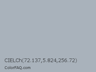 CIELCh 72.137,5.824,256.72 Color is a light blue color and the nearest color is Bombay #afb1b8. Hex code #a9b2bb and RGB value is rgb(169,178,187). In RGB color space, this color is composed of 66% red, 70% green, 73% blue, In CMYK color space, this color is composed of 10% cyan, 5% magenta, 0% yellow , 27% black , In HSL color space, this color has a hue angle of 210° , 12% saturation and 70% lightness.