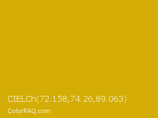 CIELCh 72.158,74.26,89.063 Color is a normal yellow color and the nearest color is Galliano #dcb20c. Hex code #d4ad05 and RGB value is rgb(212,173,5). In RGB color space, this color is composed of 83% red, 68% green, 2% blue, In CMYK color space, this color is composed of 0% cyan, 18% magenta, 98% yellow , 17% black , In HSL color space, this color has a hue angle of 49° , 95% saturation and 43% lightness.