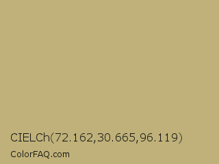 CIELCh 72.162,30.665,96.119 Color is a light yellow color and the nearest color is Misty Moss #bbb477. Hex code #bfb179 and RGB value is rgb(191,177,121). In RGB color space, this color is composed of 75% red, 69% green, 47% blue, In CMYK color space, this color is composed of 0% cyan, 7% magenta, 37% yellow , 25% black , In HSL color space, this color has a hue angle of 48° , 35% saturation and 61% lightness.
