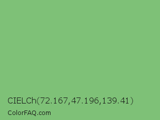 CIELCh 72.167,47.196,139.41 Color is a light green color and the nearest color is Iguana Green #71bc78. Hex code #7ec177 and RGB value is rgb(126,193,119). In RGB color space, this color is composed of 49% red, 76% green, 47% blue, In CMYK color space, this color is composed of 35% cyan, 0% magenta, 38% yellow , 24% black , In HSL color space, this color has a hue angle of 114° , 37% saturation and 61% lightness.