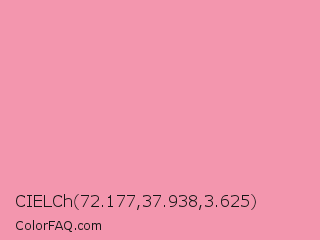 CIELCh 72.177,37.938,3.625 Color is a light red color and the nearest color is Mauvelous #ef98aa. Hex code #f396ae and RGB value is rgb(243,150,174). In RGB color space, this color is composed of 95% red, 59% green, 68% blue, In CMYK color space, this color is composed of 0% cyan, 38% magenta, 28% yellow , 5% black , In HSL color space, this color has a hue angle of 345° , 79% saturation and 77% lightness.