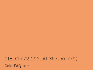 CIELCh 72.195,50.367,56.779 Color is a light orange color and the nearest color is Sandy Brown #f4a460. Hex code #f49c65 and RGB value is rgb(244,156,101). In RGB color space, this color is composed of 96% red, 61% green, 40% blue, In CMYK color space, this color is composed of 0% cyan, 36% magenta, 59% yellow , 4% black , In HSL color space, this color has a hue angle of 23° , 87% saturation and 68% lightness.