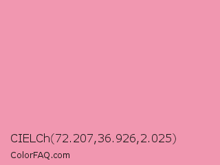 CIELCh 72.207,36.926,2.025 Color is a light rose color and the nearest color is Wewak #f19bab. Hex code #f197b0 and RGB value is rgb(241,151,176). In RGB color space, this color is composed of 95% red, 59% green, 69% blue, In CMYK color space, this color is composed of 0% cyan, 37% magenta, 27% yellow , 5% black , In HSL color space, this color has a hue angle of 343° , 76% saturation and 77% lightness.