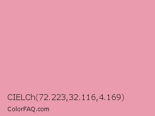 CIELCh 72.223,32.116,4.169 Color is a light red color and the nearest color is Mauvelous #ef98aa. Hex code #ea9bae and RGB value is rgb(234,155,174). In RGB color space, this color is composed of 92% red, 61% green, 68% blue, In CMYK color space, this color is composed of 0% cyan, 34% magenta, 26% yellow , 8% black , In HSL color space, this color has a hue angle of 346° , 65% saturation and 76% lightness.