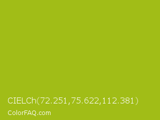 CIELCh 72.251,75.622,112.381 Color is a normal yellow color and the nearest color is Citrus #a1c50a. Hex code #a1bd17 and RGB value is rgb(161,189,23). In RGB color space, this color is composed of 63% red, 74% green, 9% blue, In CMYK color space, this color is composed of 15% cyan, 0% magenta, 88% yellow , 26% black , In HSL color space, this color has a hue angle of 70° , 78% saturation and 42% lightness.