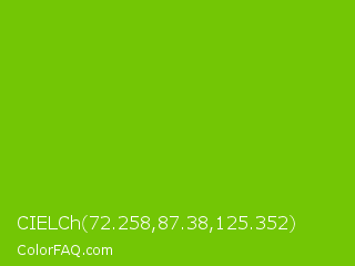 CIELCh 72.258,87.38,125.352 Color is a normal green color and the nearest color is Lima #76bd17. Hex code #73c605 and RGB value is rgb(115,198,5). In RGB color space, this color is composed of 45% red, 78% green, 2% blue, In CMYK color space, this color is composed of 42% cyan, 0% magenta, 97% yellow , 22% black , In HSL color space, this color has a hue angle of 86° , 95% saturation and 40% lightness.