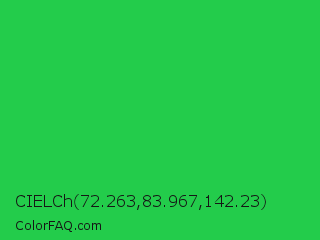 CIELCh 72.263,83.967,142.23 Color is a normal green color and the nearest color is Malachite #0bda51. Hex code #23cc4b and RGB value is rgb(35,204,75). In RGB color space, this color is composed of 14% red, 80% green, 29% blue, In CMYK color space, this color is composed of 83% cyan, 0% magenta, 63% yellow , 20% black , In HSL color space, this color has a hue angle of 134° , 71% saturation and 47% lightness.