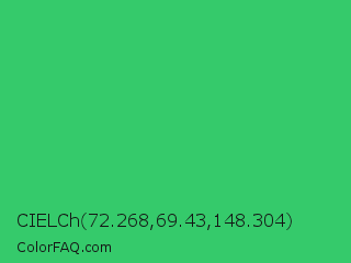 CIELCh 72.268,69.43,148.304 Color is a normal green color and the nearest color is UFO Green #3cd070. Hex code #35ca6b and RGB value is rgb(53,202,107). In RGB color space, this color is composed of 21% red, 79% green, 42% blue, In CMYK color space, this color is composed of 74% cyan, 0% magenta, 47% yellow , 21% black , In HSL color space, this color has a hue angle of 142° , 58% saturation and 50% lightness.
