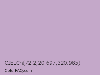 CIELCh 72.2,20.697,320.985 Color is a light purple color and the nearest color is Lilac #c8a2c8. Hex code #c4a8c9 and RGB value is rgb(196,168,201). In RGB color space, this color is composed of 77% red, 66% green, 79% blue, In CMYK color space, this color is composed of 2% cyan, 16% magenta, 0% yellow , 21% black , In HSL color space, this color has a hue angle of 291° , 23% saturation and 72% lightness.