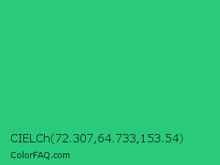 CIELCh 72.307,64.733,153.54 Color is a normal green color and the nearest color is UFO Green #3cd070. Hex code #29ca7a and RGB value is rgb(41,202,122). In RGB color space, this color is composed of 16% red, 79% green, 48% blue, In CMYK color space, this color is composed of 80% cyan, 0% magenta, 40% yellow , 21% black , In HSL color space, this color has a hue angle of 150° , 66% saturation and 48% lightness.